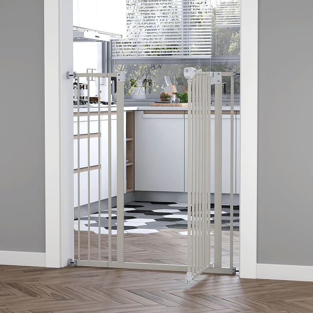 · CONFIGURAÇÃO INTELIGENTE: Quando o ângulo de abertura da porta for inferior a 90° e superior a 15°, se fechará automáticamente ao soltá·la. Se o ângulo de abertura for superior a 90° permanecerá aberta · DUPLO BLOQUEIO: Esta porta além de ter um bloqueio de abertura e fechadura na parte superior, conta com duas travas, uma em casa lado da porta para poder determinar o sentido da abertura da porta, ou fixá·la por completo utilizando·os ao mesmo tempo · RESISTENTE: Esta barreira de segurança para animais de estimação está fabricada de metal tratado sem chumbo e não tóxico, de alta resistência para um uso prolongado. Ideal para proteger seus animais de estimação · FÁCIL DE MONTAR: Esta barreira de segurança com extensões, requer uma montagem fácil e rápida, sem necessidade de esforço. Lembre·se de fixar a barreira mediante aos parafusos de ajuste, até que a abertura da porta seja de 2·3mm para que não fique muito apertada e não possa abrir com normalidade · MEDIDAS TOTAIS: (sem extensão) 74·84×104,1cm (CxA); Medidas totais com extensão: 92·102×104,1cm (CxA); Largura da entrada: 49 cm; Nota: Esta barreira de segurança somente é apta para aberturas de 74·84cm o 92·102cm, comprove as medidas de sua abertura antes de comprar este produto Se você tem animais de estimação em casa e deseja limitar o espaço ou protegê·los das escadas, esta barreira para animais de estimação de PawHut é ideal. Conta com uma porta com fechadura com sistema de fechamento automático. É uma barreira de segurança muito fácil de instalar e te poupará tempo e esforço. Fabricada de metal possui 4 parafusos de ajuste e uma parte extensível, na qual poderá regular está barreira de 74·84cm ou 92·102cm, de acordo com suas necessidades de uso. É ideal para familias com animais de estimação Características · Fácil acesso através da trava de abertura na parte superior, na qual pode ser aberta somente uma mão · Estrutura metálica para maior resistência e durabilidade · Fechamento inteligente para maior conforto ao fechar a porta · Conta com 2 travas na parte inferior para determinar o sentido da abertura da porta · Adaptável a diferentes larguras através dos parafusos de ajuste e a extensão · Ideal para casa com animais de estimação, apto para portas, corredores, escadas, etc. · Requer montagem · NOTA: Esta barreira de segurança somente é apta para aberturas de 74·84cm ou 92·102cm, comprove as medidas antes de comprar esse produto Especificações · Cor: Branco · Material: Metal e plástico · Medidas totais com extensão: 92·102×104,1cm (CxA) · Medidas totais sem extensão: 74·84×104,1cm (CxA) · Largura da entrada: 49cm · Distância entre as barras: 5 cm · Referencia: D06·095
