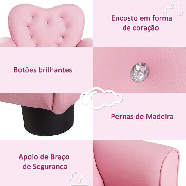 · SOFÁ ELEGANTE: Com um encosto em forma de coração e seus brilhantes botões, este sofá infantil acrescentará um toque original a qualquer habitação infantil, sala de jogos ou a sala de estar de sua casa · SUAVE E CONFORTÁVEL: O sofá está estofado com tecido de PVC resistente ao desgaste e é fácil de limpar com um pano umido. O assento, o encosto e o apoio para os braços acolchoados garantem o máximo conforto para os mais pequenos · ESTRUTURA RESISTENTE: Fabricada com uma robusta estrutura de madeira, este sofá infantil pode suportar até 45kg. Conta com pés antiderrapantes para maior estabilidade e evitar que os chão se arranhe ao movê·lo · DESENHO LEVE: Graças ao seu desenho leve e tamanho adequado, as crianças poderão mover este móvel de um lugar a outro sem muito esforço. Também ajudará na sua · MEDIDAS TOTAIS: Sofá: 59×41,5x49cm (CxLxA); Medidas do assento: 31x30x19cm (CxLxA); Peso máximo suportado: 45kg; Certificação: EN71·1·2·3. Recomendado a partir de 3 anos Se você pensava que somente os adultos poderiam desfrutar do conforto de um sofá, você estava enganado. A relaxação para os pequenos chegou graças a este sofá infantil de HOMCOM. Conta com um bonito encosto em forma de coração e apoio para os braços acolchoado. Suporta até 45kg e é fácil de limpar, pelo que é ideal para as crianças pequenas. Com certeza ele se tornará o lugar favorito dos mais pequenos para assistir filmes, brincar ou ler um livro Características · Sofá em bonita cor rosa e forma de coração, chamará a atenção dos mais pequenos · Com apoio para os braços redondos, confortáveis e seguras · Estrutura de madeira com pés antiderrapantes para maior estabilidade e para evitar arranhões no chão · Revestimento de PVC e estofado confortável em espuma · Encosto em forma de coração e botões brilhantes · Acessórios de decoração perfeito para dormitório e sala de jogos · Acabado elegante e fácil de limpar Especificações · Cor: Rosa · Material: PVC, madeira e espuma · Medidas do sofá: 59×41,5x49cm (CxLxA) · Medidas do assento: 31x30x19cm (CxLxA) · Idade recomendada: A partir de 3 anos · Peso máximo suportado: 45 kg · Certificações: EN71·1·2·3 · Referência: 310·025